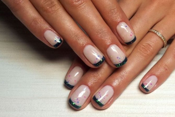 Для женщин, которые стремятся выделиться или обратить на себя внимание, поможет французский маникюр шеллаком ярких или темных тонов. Например, дизайн, где свободный край выполнен черным цветом с окантовкой из блесток, не оставит равнодушными любителей черных и темных цветов.